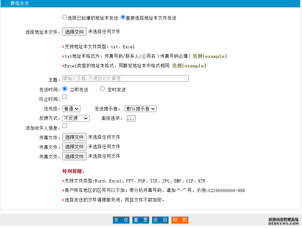 用巨象網(wǎng)絡(luò)傳真平臺群發(fā)傳真,操作非常方便,你只需要將你發(fā)送的號碼導(dǎo)入系統(tǒng)構(gòu)建地址本,或者選擇你的地址本文件,再選擇你要發(fā)送的文件,如下圖所示,點(diǎn)發(fā)送即可完成群發(fā)傳真操作