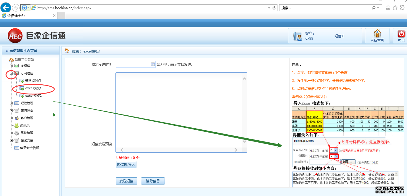 二、注冊開通賬號后登錄平臺,點擊左側導航條的訂制短信,如下圖所示選擇模版1即可進行工資條短信批量發送。