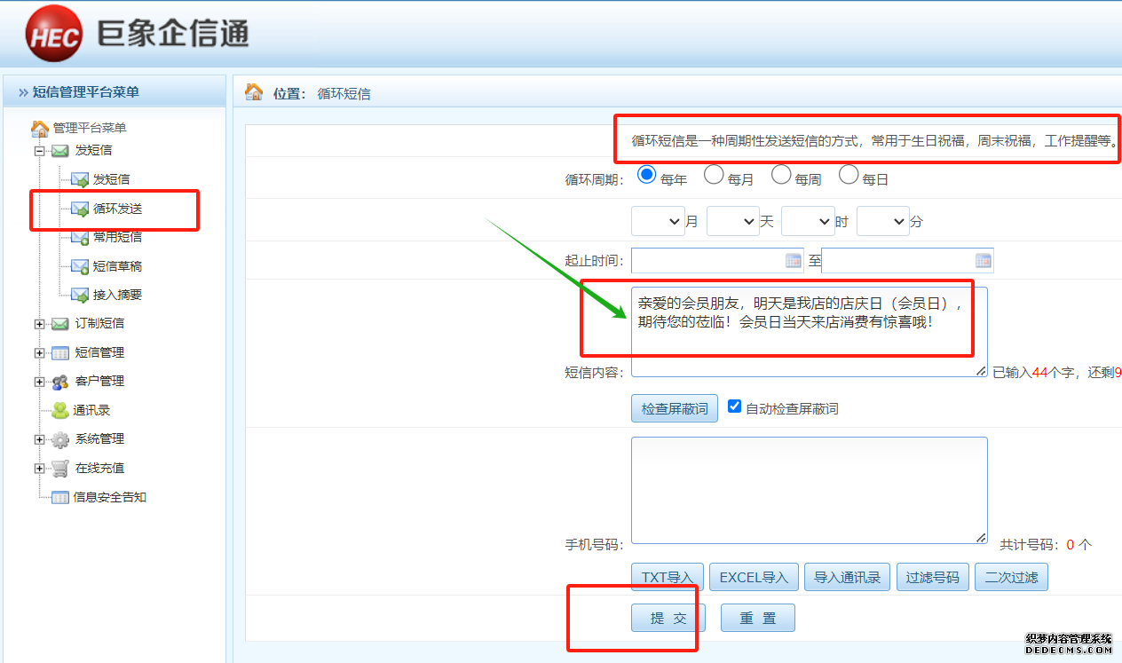 第二步、聯系客服開通自動定時循環發送短信的功能
